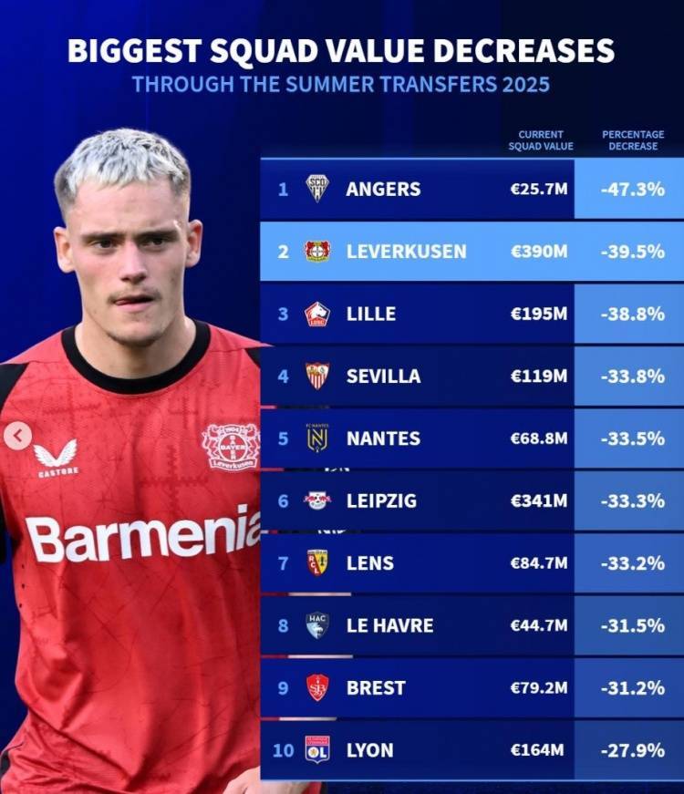 直播吧9月7日讯 《转会市场》统计了今夏转会窗过后的总身价下降比例情况,昂热居首,法甲7队在列。